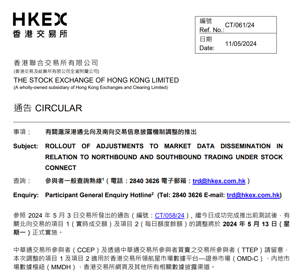5月11日,港交所发布公告,参照2024年5月3日交易所发出的通告, 继今日成功完成推出前测试后,有关北向交易的实时成交额及每日额度余额的调整将于5月13日(星期一)正式实施。