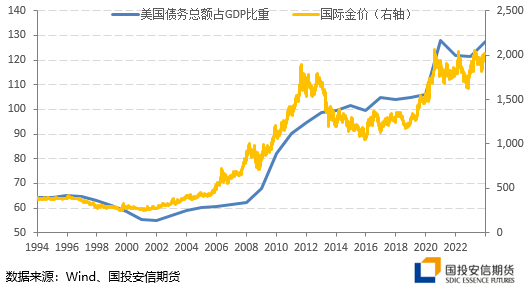 黄金信用对冲的核心逻辑不变,长期支撑黄金走势。2020年疫情爆发后,美国开启天量放水使得债务暴增,2023年美国国债总额已突破34万亿美元大关,债务挑战意味着潜在风险和信用冲击。而2022年俄乌战争后美国将美元支付体系武器化,任意经济制裁他国产生了信任危机,尽管美元在短期内地位难以动摇,但全球的去美元化趋势已经不可忽视。更多国家采取措施来降低对美元的依赖,在非美货币尚不具备很强竞争力的情况下,黄金作为硬通货成为各国关注的重要储备资产。作为美元信用风险的体现,美国债务总额占GDP比重与国际金价走势体现非常高的相关性。