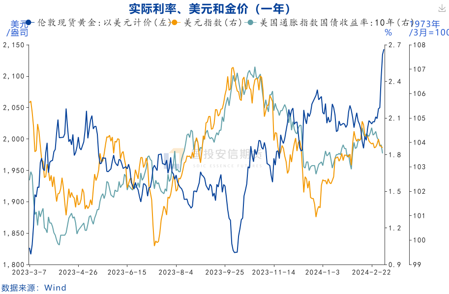 1月以来随着经济数据和美联储方面偏鹰论调的延续,预期在持续修正,截止2月底美联储观察显示市场已经放弃对3月5月降息的押注,首次降息推迟至6月,年内降息3次与12月美联储会议点阵图一致。预期的充分修正使得限制黄金的重大压力解除,为最近一周黄金大幅上涨提供了基础。